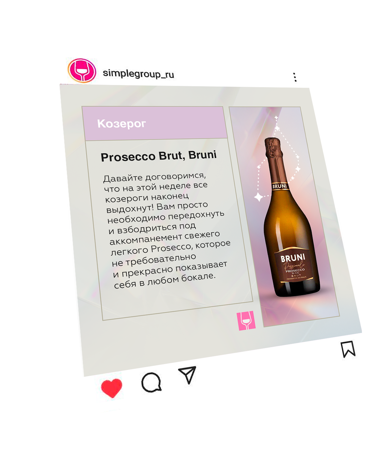 Situational posts were a key tool for creating diverse content, and reacting to hot trends and widely discussed events. These posts were among some of the most popular on all of the brand’s platforms. For example, we created a wine-based horoscope - a viral post with fortunes based on wine culture. The horoscope helped users pick a perfect bottle of wine for their star sign on any given evening (ERR on Instagram — 5,83%, on VKontakte - 9,96%).
